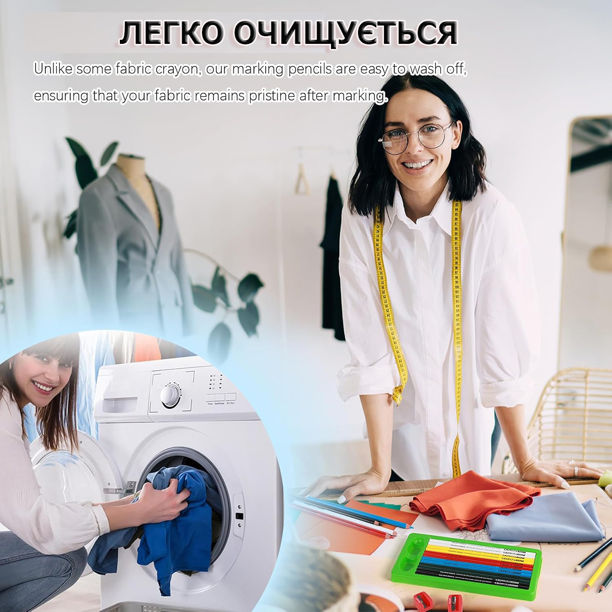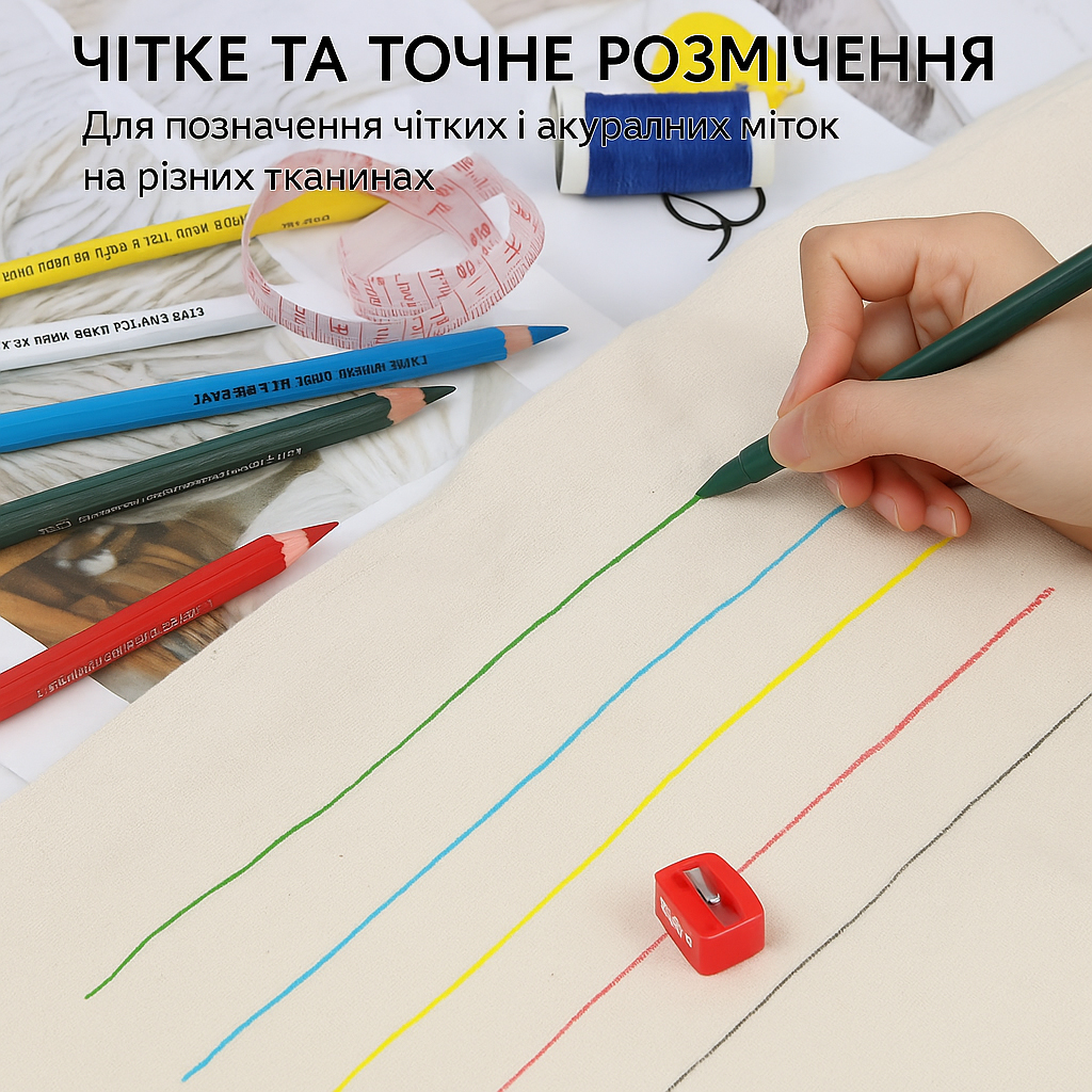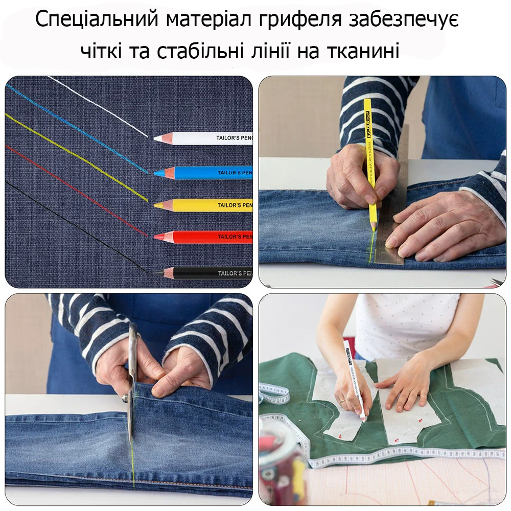 Карандаши отлично подходят для шитья, квилтинга, портновских работ и моделирования одежды. Яркие линии легко различимы на любой ткани, будь то хлопок, джинс или кожа, при этом не пачкают руки.