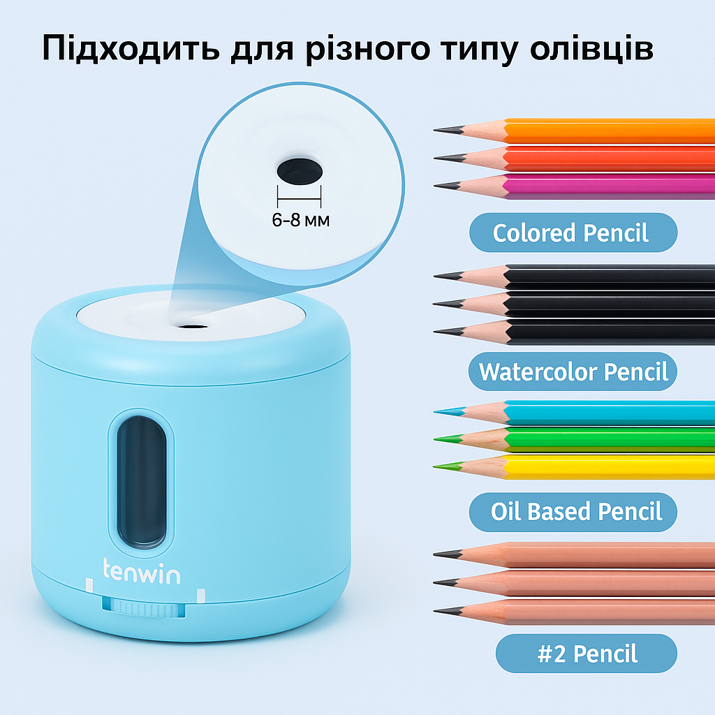 Благодаря универсальному отверстию (6–8 мм), точилка совместима с большинством типов карандашей (кроме угольных и восковых).