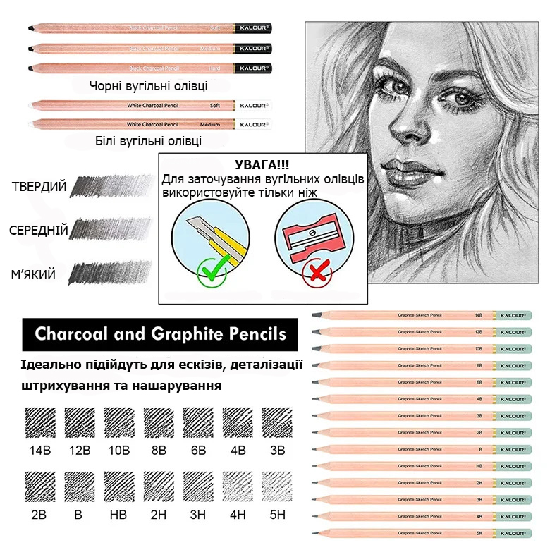 14 графитовых карандашей (5H, 4H, 3H, 2H, HB, B, 2B, 3B, 4B, 6B, 8B, 10B, 12B, 14B) — для точных линий, мягкой штриховки и глубоких теней.