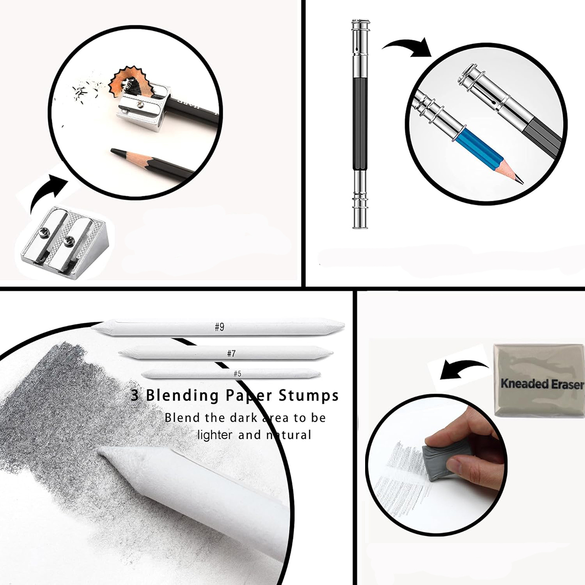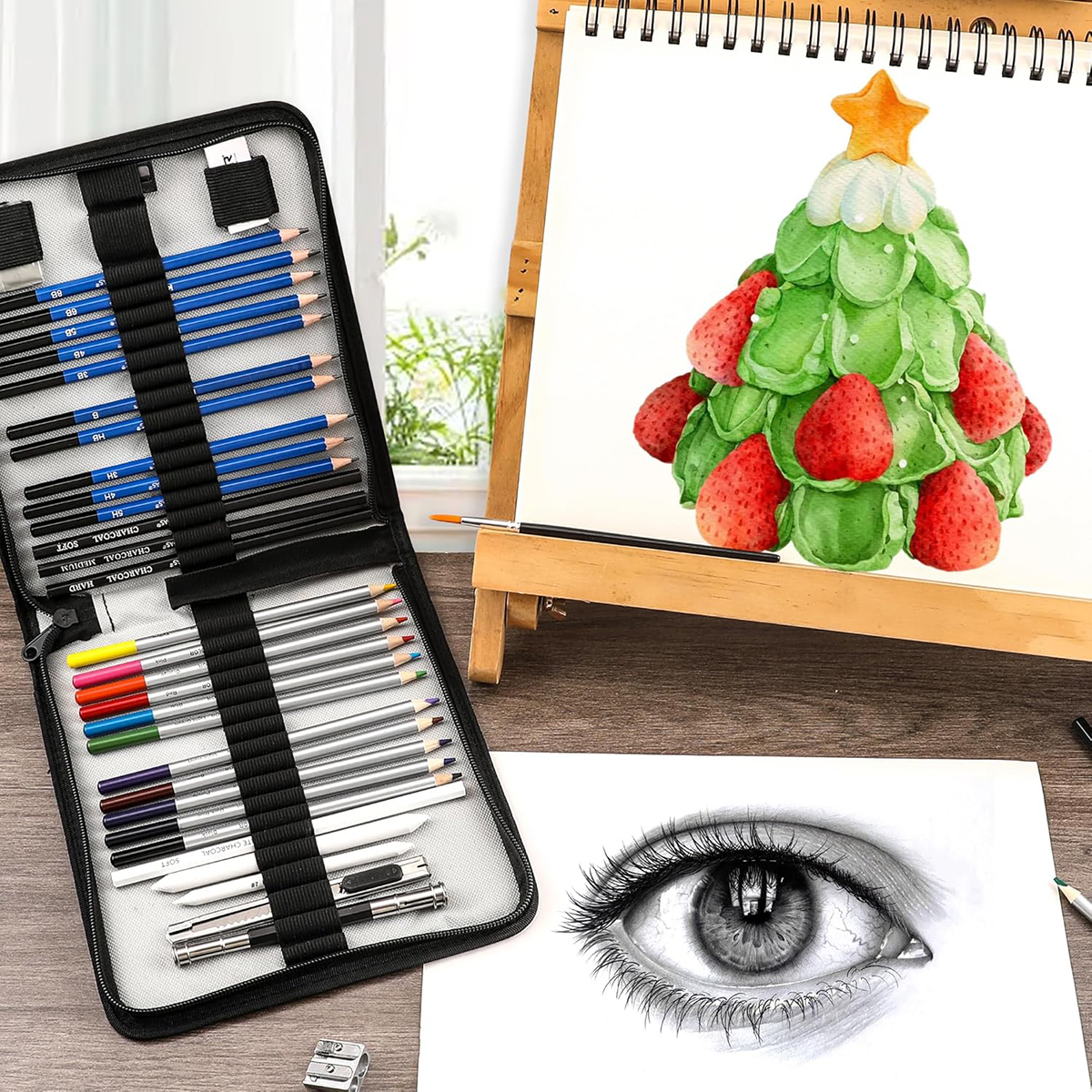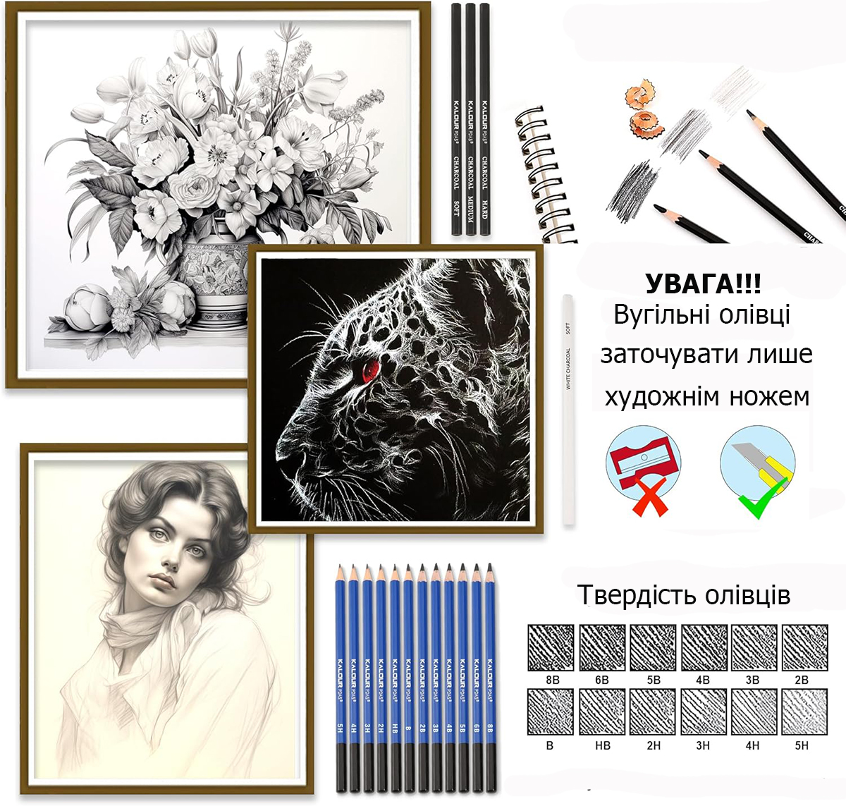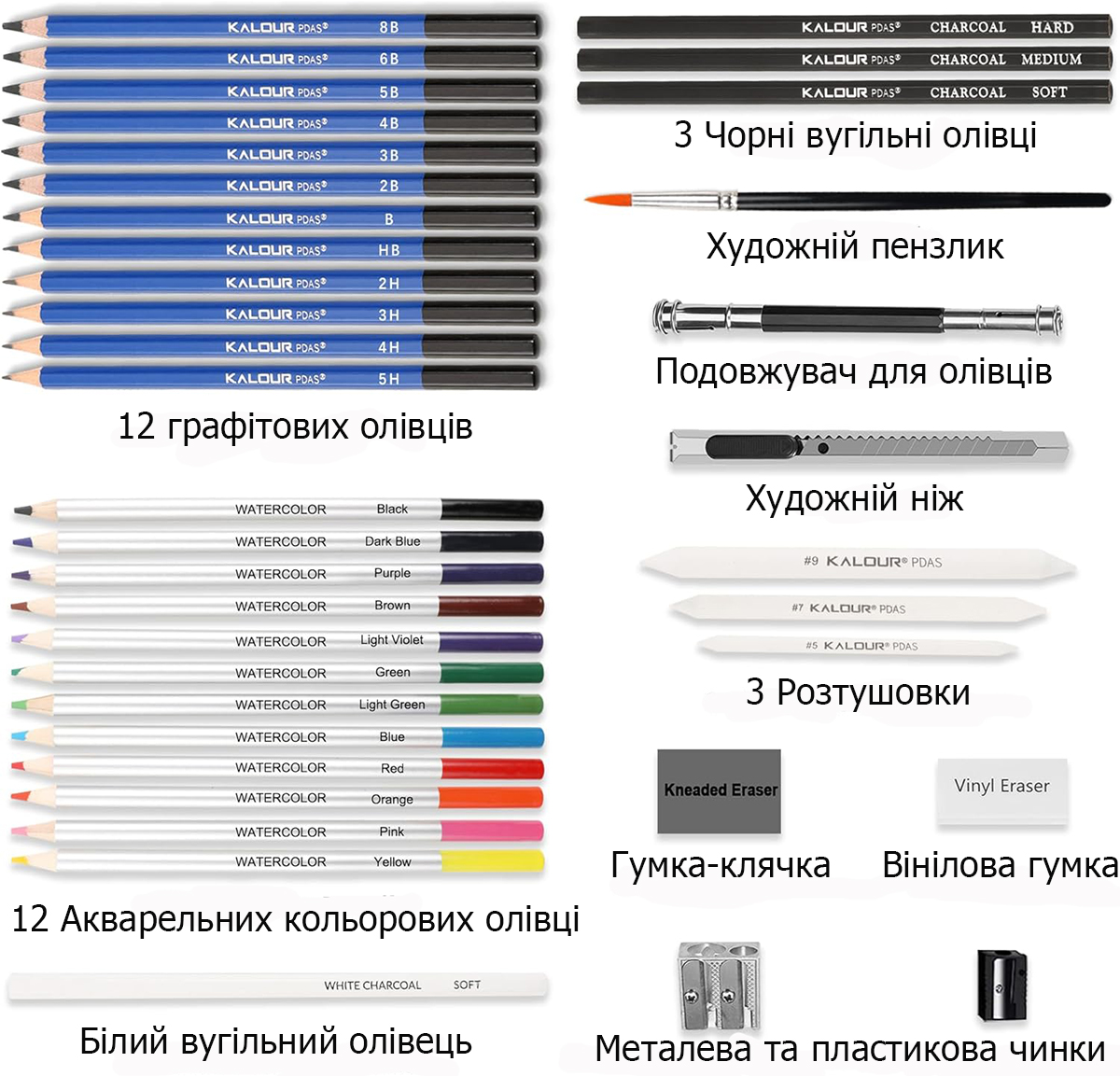 У набір входять 12 графітових олівців, 12 акварельних кольорових олівців, 3 вугільні олівці, білий вугільний олівець, а також додаткові аксесуари: художній ніж, подовжувач для олівців, художній пензлик, 3 розтушовки, ластики двох типів (вініловий і клячка). Всі інструменти акуратно розміщені у міцному нейлоновому чохлі з блискавкою, що робить набір максимально зручним для зберігання та перенесення.