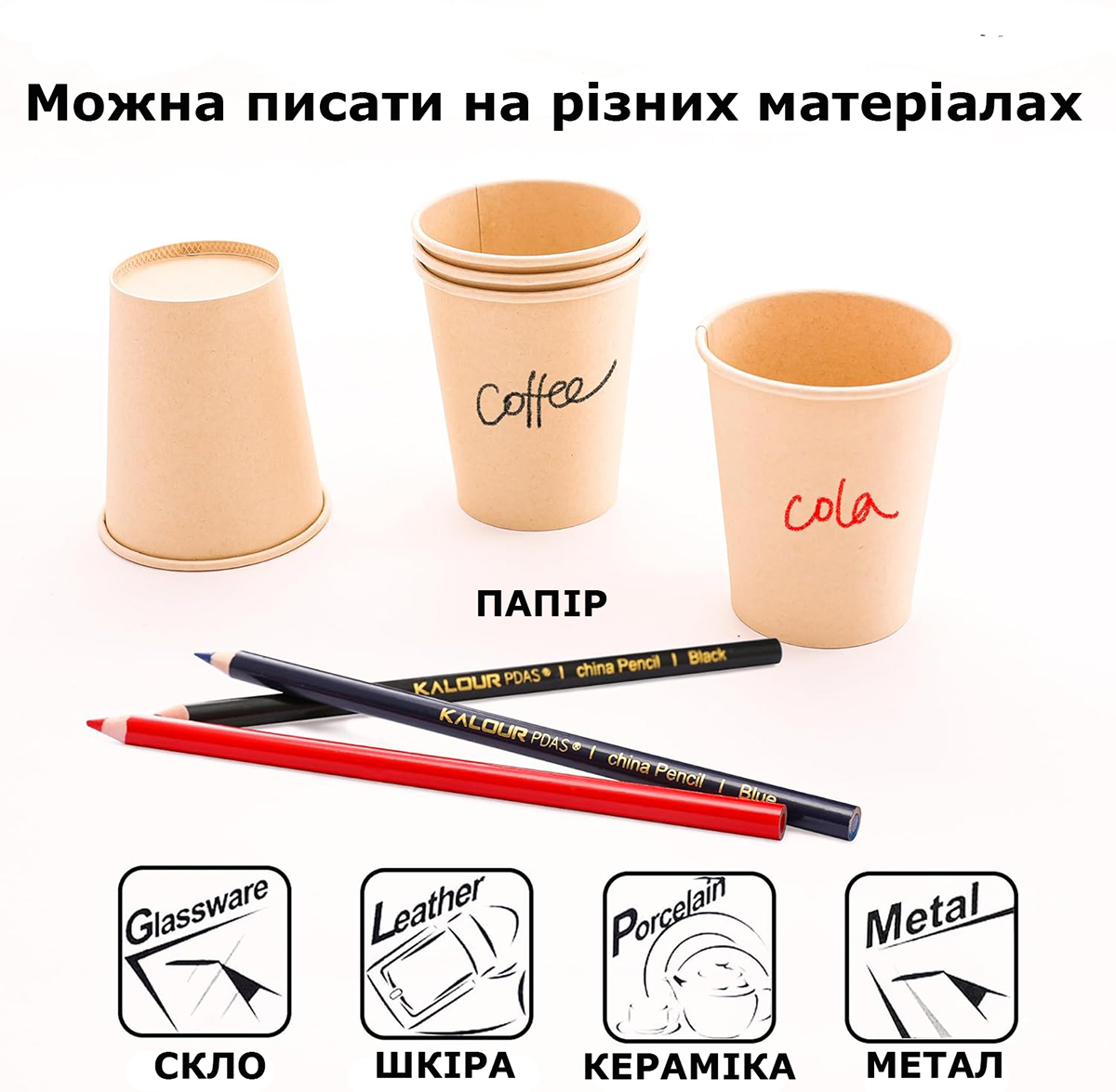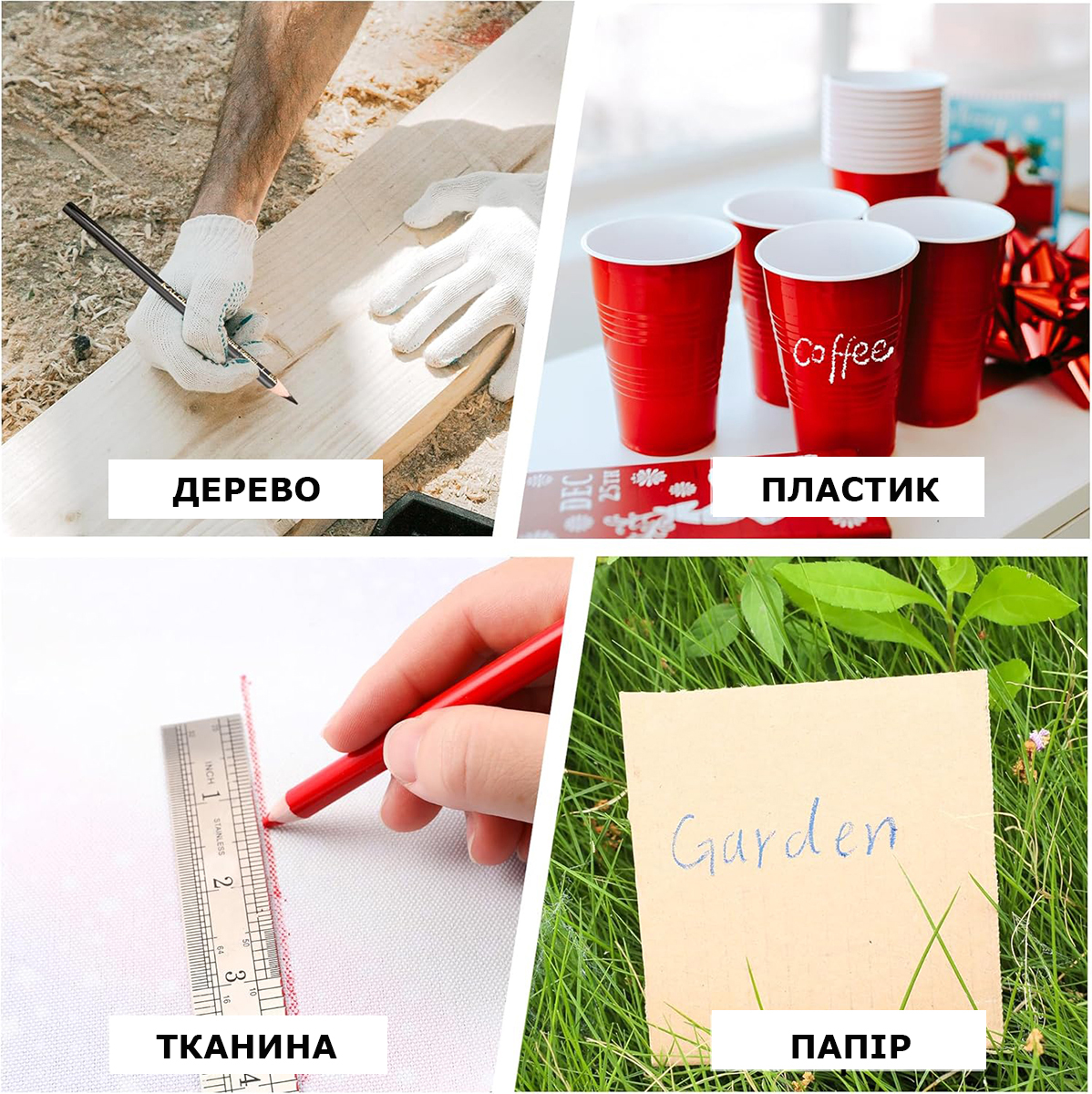 Карандаши легко оставляют яркий, насыщенный след даже на сложных материалах: стекле, пластике, металле, керамике, дереве и тканях. Благодаря масляной основе линии хорошо видны и не стираются случайно, но при необходимости легко удаляются влажной салфеткой или тканью.