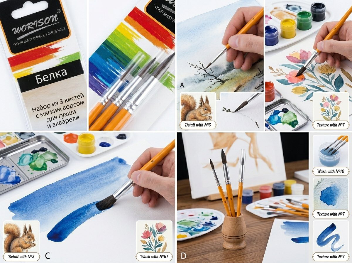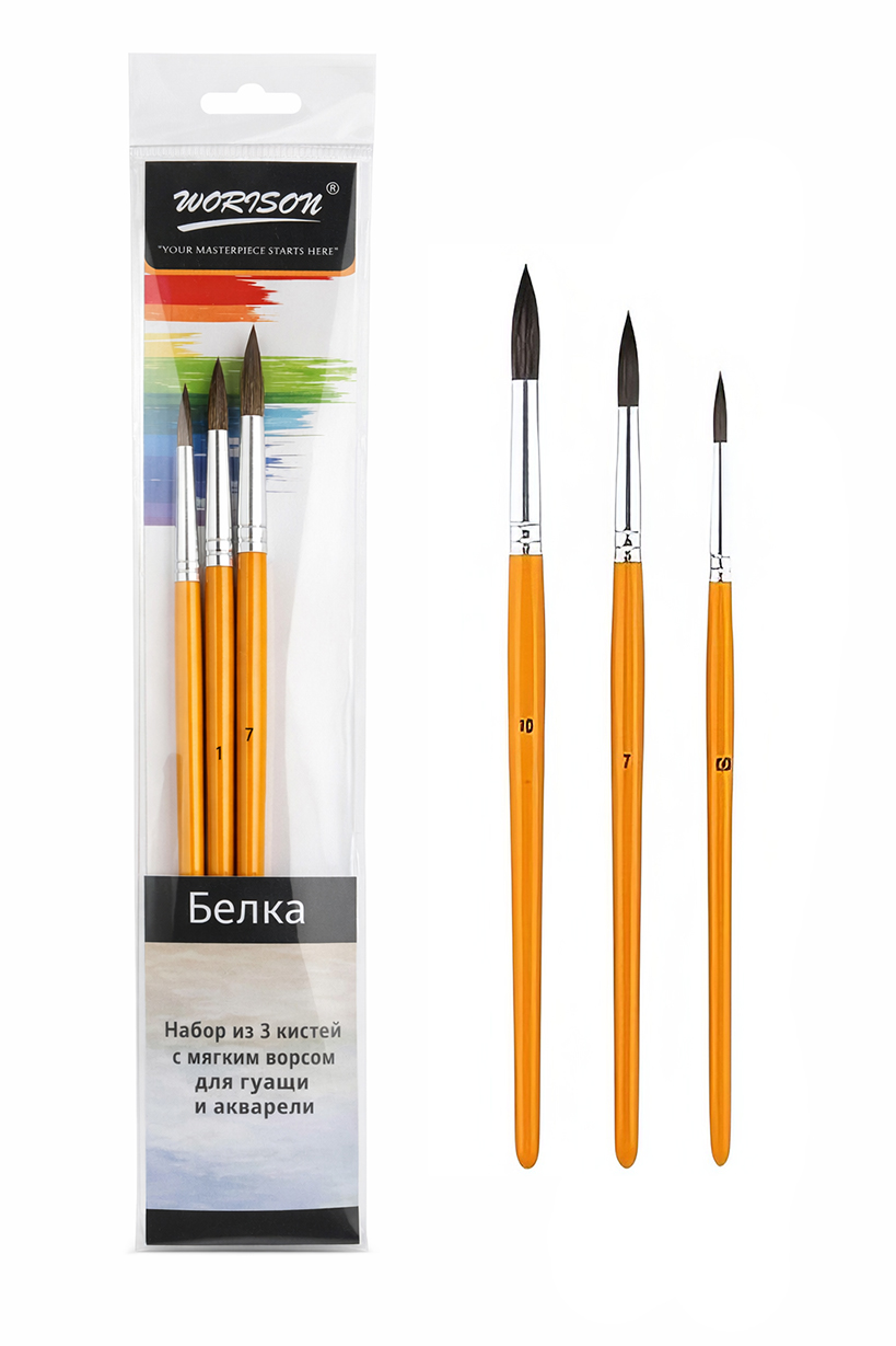 Набір пензлів WORISON Білка №4, №7, №10 з натурального ворсу для акварелі, гуаші та акрилу. М`які круглі пензлі з високим поглинанням, ідеальні для деталей і заливок.
